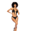 Maak je klaar om te spelen in deze leuke tweedelige set met een fringed halter triangle top en een bijpassende fringe panty met een open rug en een rits aan de voorkant.