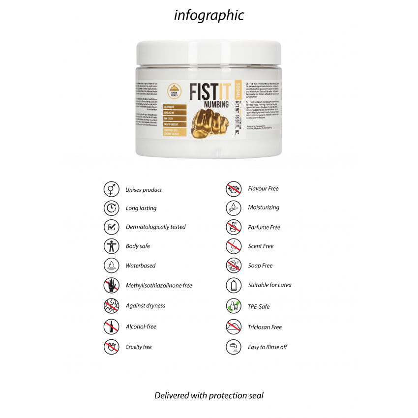 Fist It Numb is een glijmiddel op waterbasis. Geschikt voor gebruik met latex-condooms. Dermatologisch getest, vetvrij.Smeer zoveel gel als je wilt op het gewenste lichaamsdeel en herhaal zo vaak je wilt. Buiten het bereik van kleine kinderen bewaren. Koel en donker bewaren.